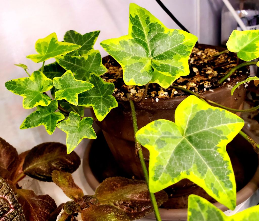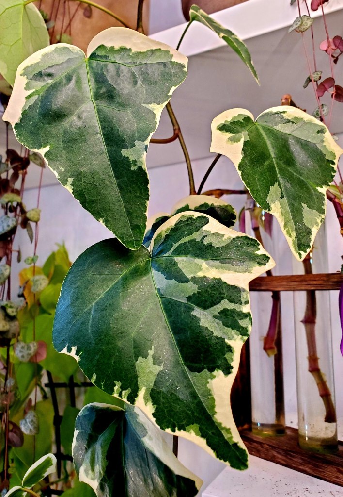 Une de mes plantes préférées à bouturer, le lierre grimpant (Hedera helix). On en trouve partout dans la rue, et il y a une infinité de variétés. Voici celles que j’ai trouvées en me promenant dans mon quartier. Se bouture super bien dans l’eau, mais aussi dans la terre. En plus, on peut rapidement avoir un bel effet vertical avec le lierre, soit en le faisant grimper ou tomber.
