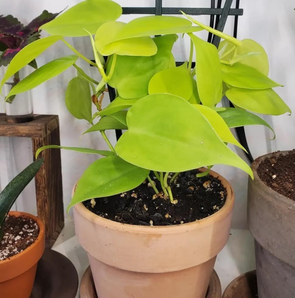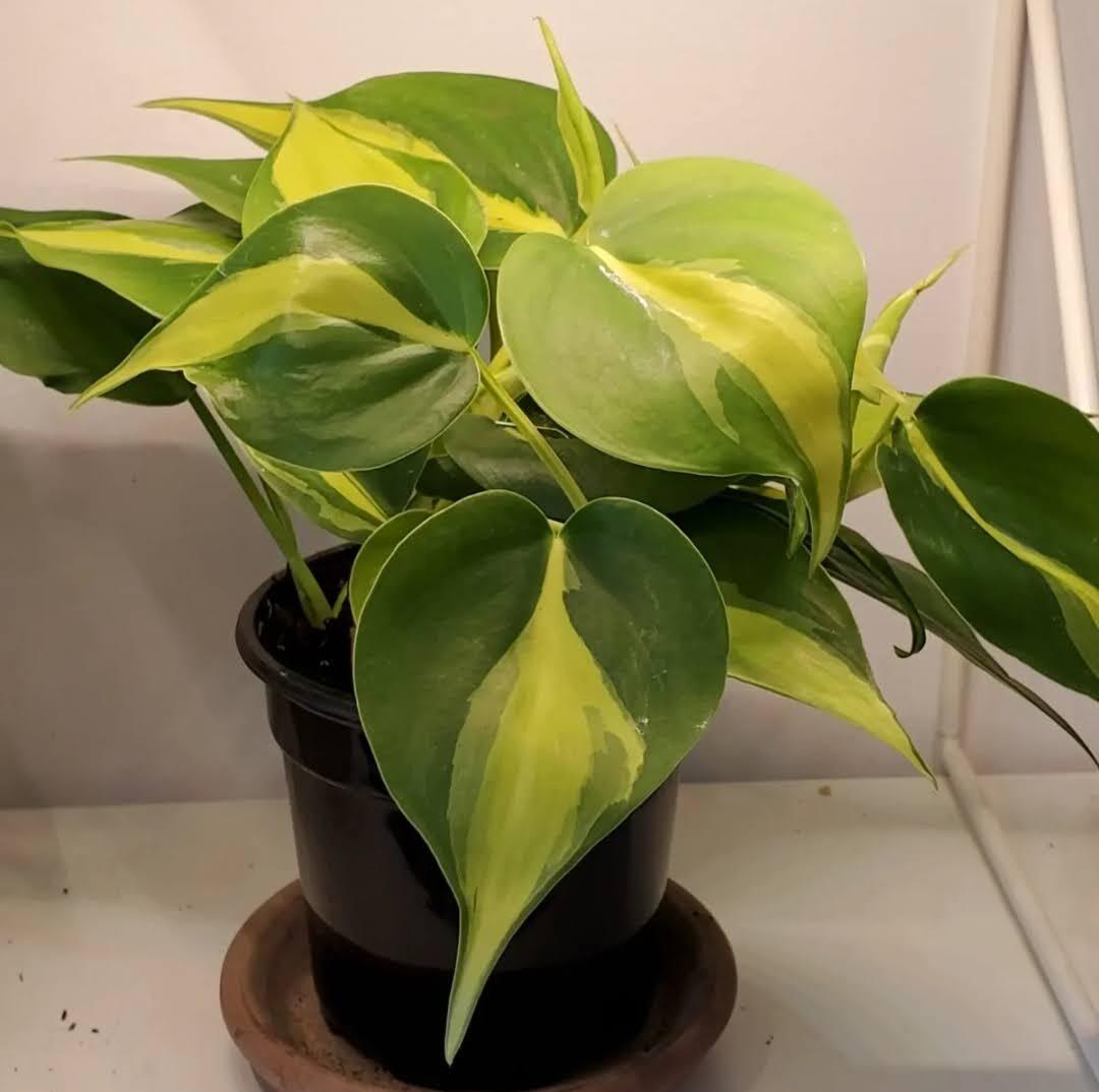 Le philodendron est très facile à trouver un peu partout, très décoratif avec ses grosses feuilles en cœur, et on peut soit le faire grimper à un tuteur ou le laisser retomber. Attention, si vous le laissez retomber, les feuilles vont devenir de plus en plus petites, alors qu’elles seront de plus en plus grosses s’il grimpe, ce qui est dans sa nature. A gauche, mon philodendron que je fais grimper à un tuteur, en haut à droite mon philo ‘Brasil’, et en bas à droite, mon philo ‘Lemon lime’.